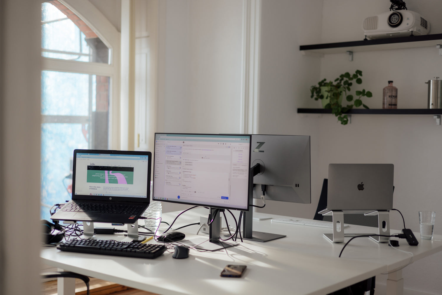 Freue dich auf einen Laptop deiner Wahl, höhenverstellbare Schreibtische und bequeme Stühle