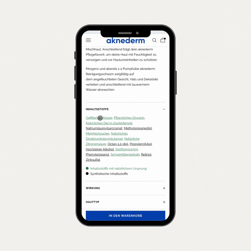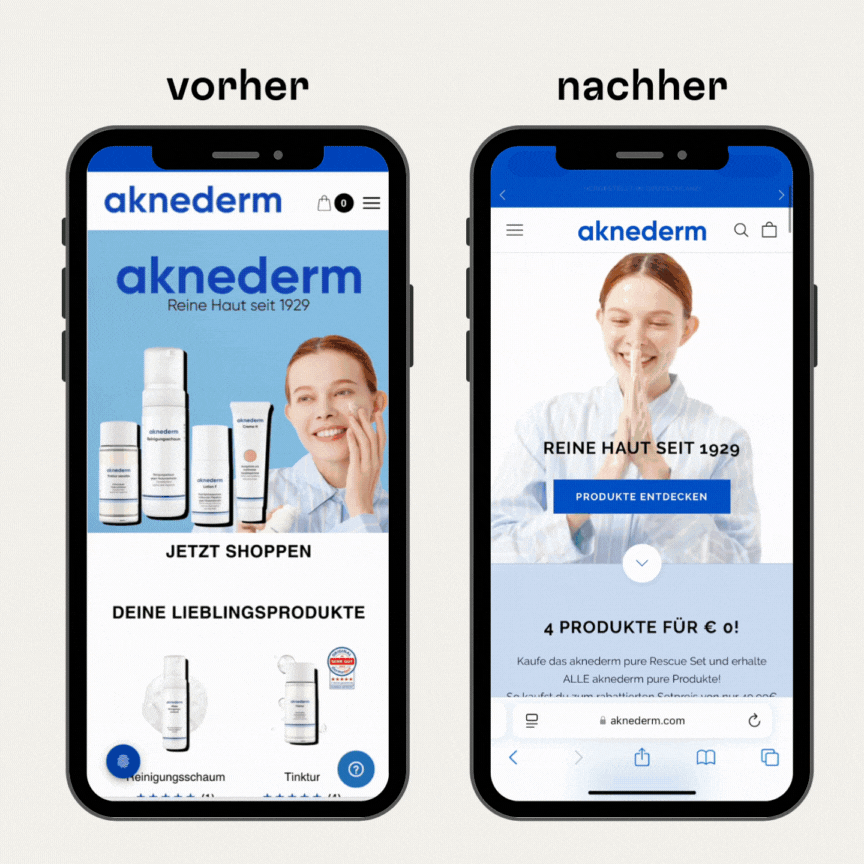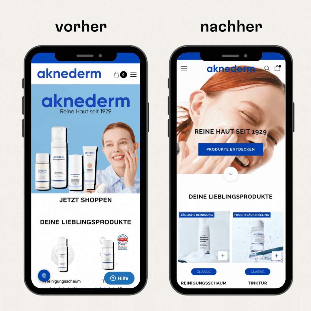 Das neue Theme überzeugt mit einer starken Bildsprache, die perfekt zur Präsentation von Kosmetik- und Pflegeprodukten passt. Durch die klare, elegante Gestaltung erhält der Shop ein hochwertiges Flair, das die Markenidentität von Aknederm optimal unterstreicht.