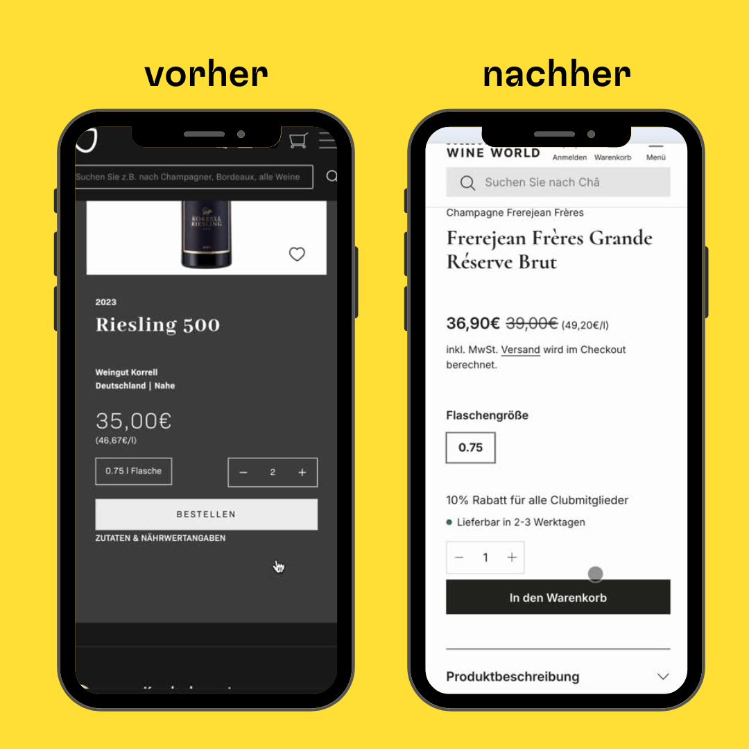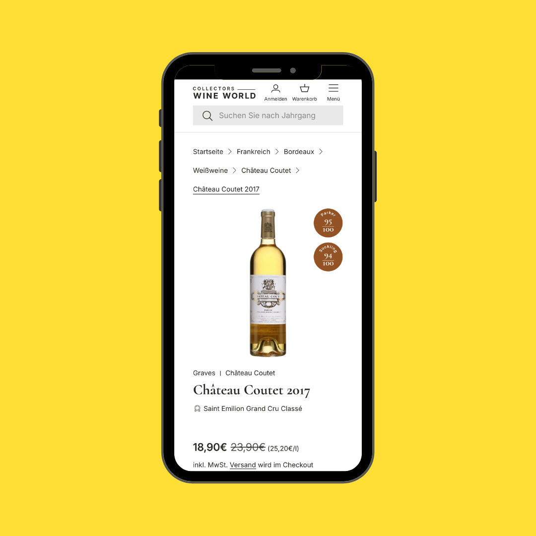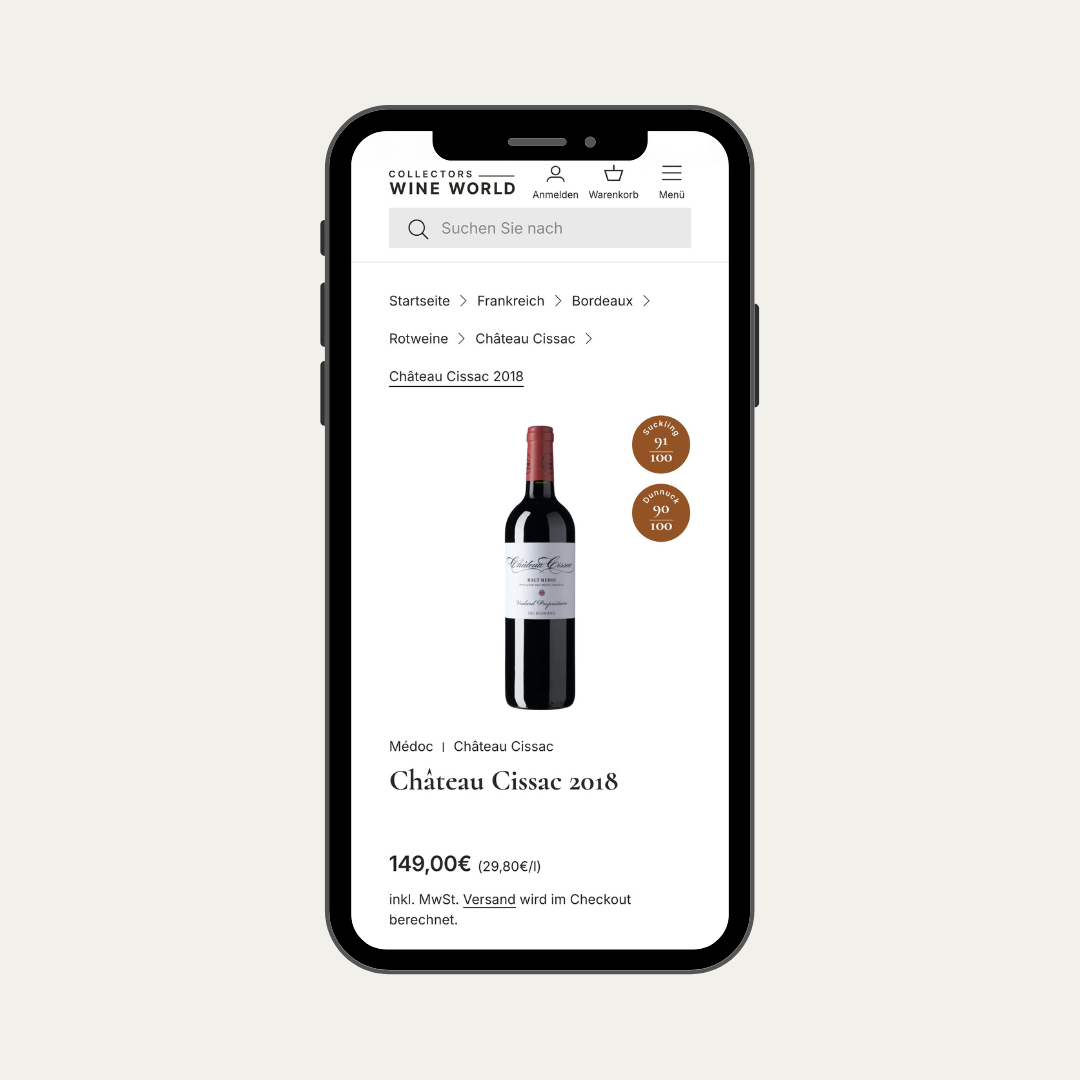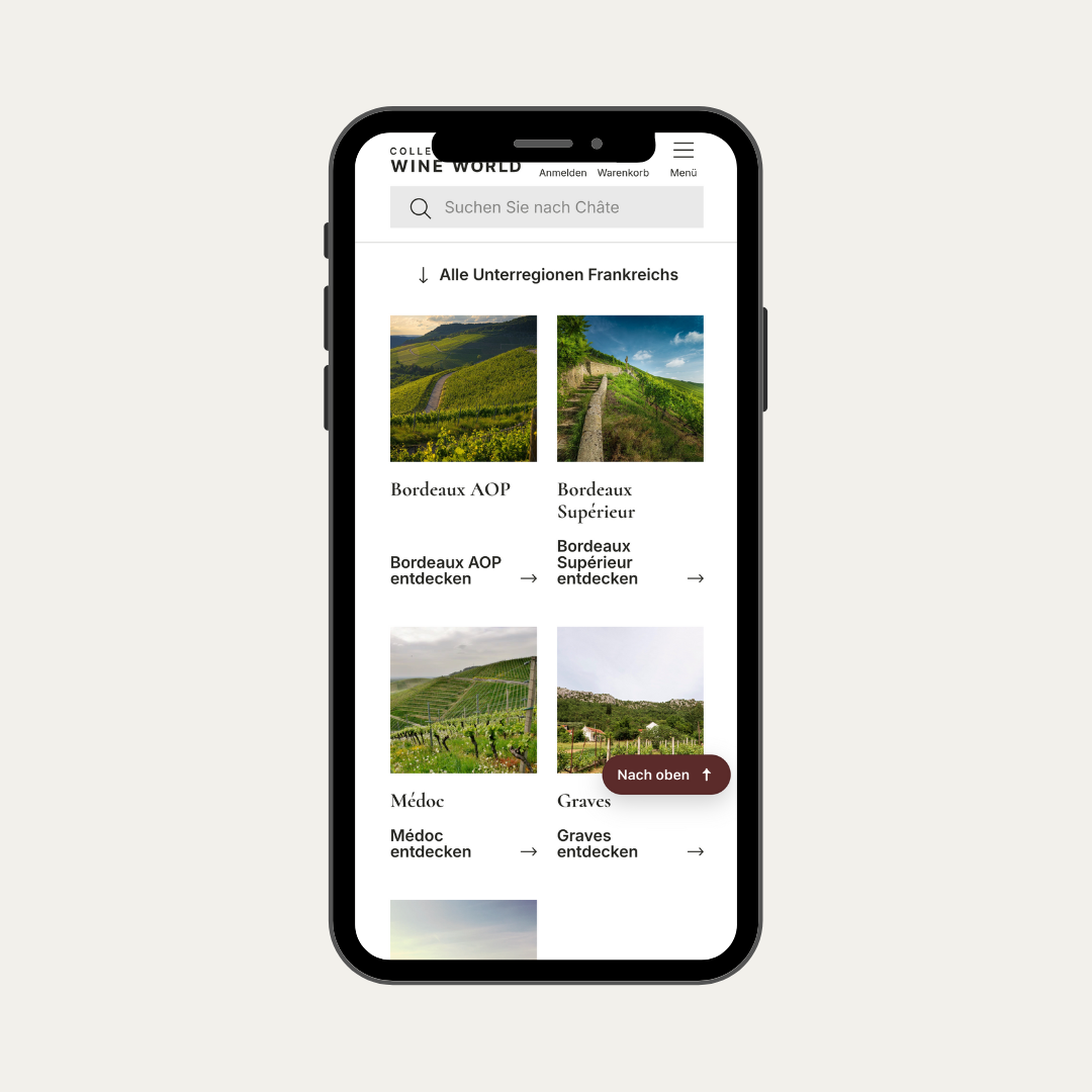 In den Produktkacheln werden wichtige Infos wie Region und Château direkt angezeigt. So erkennen Kund:innen auf einen Blick alle relevanten Merkmale, ohne erst die PDP öffnen zu müssen.