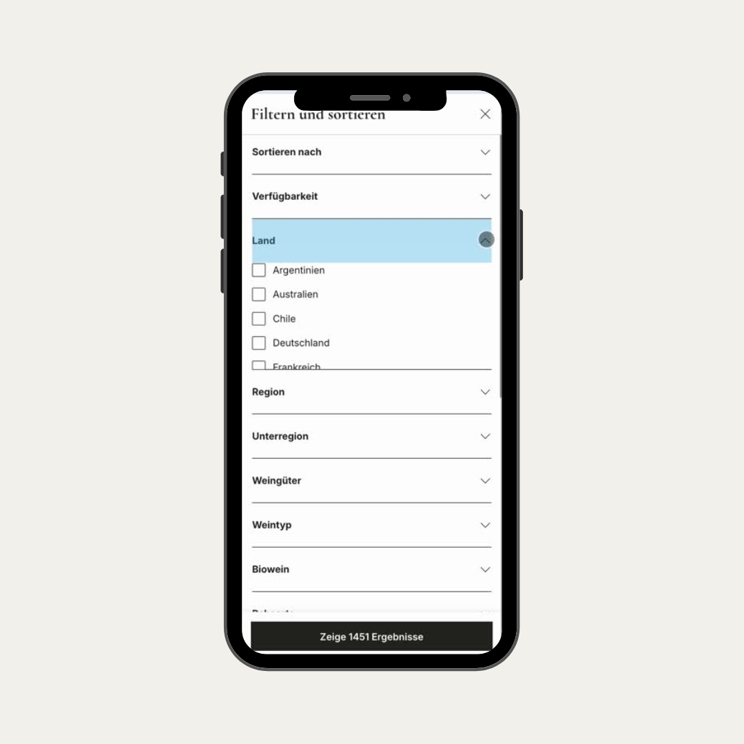 Die umfangreichen Filteroptionen sorgen dafür, dass Kund:innen gezielt nach Jahrgang, Region, Rebsorte oder Bewertung suchen können.