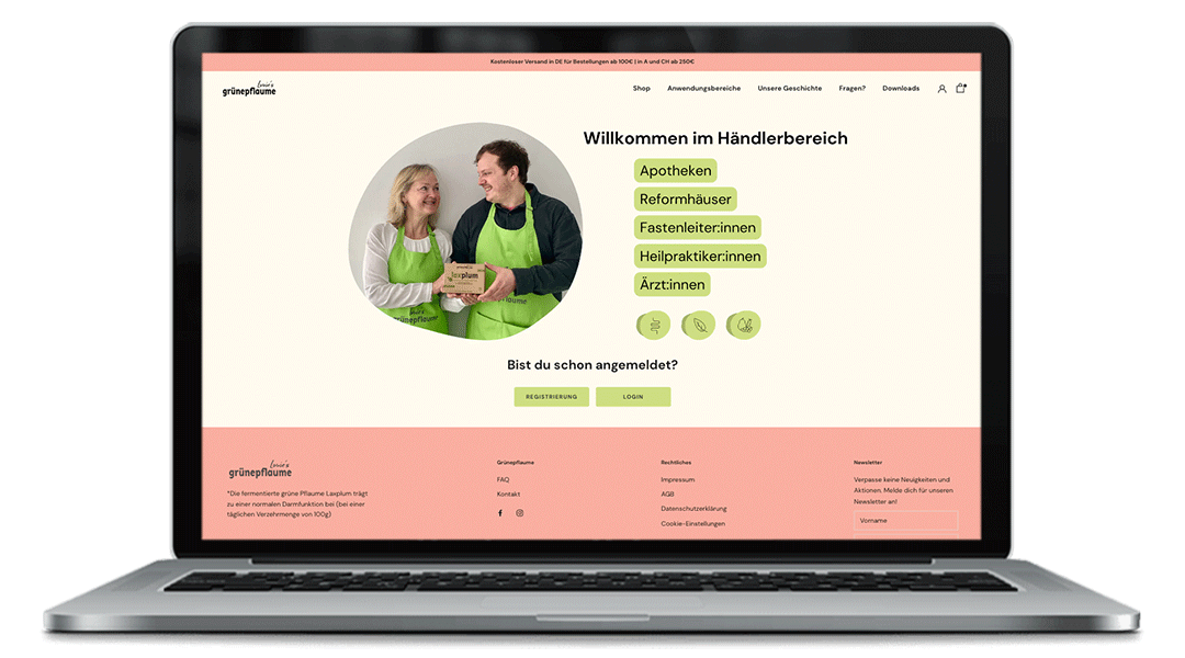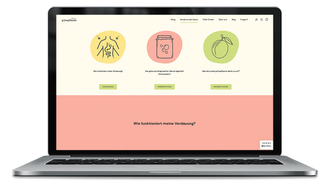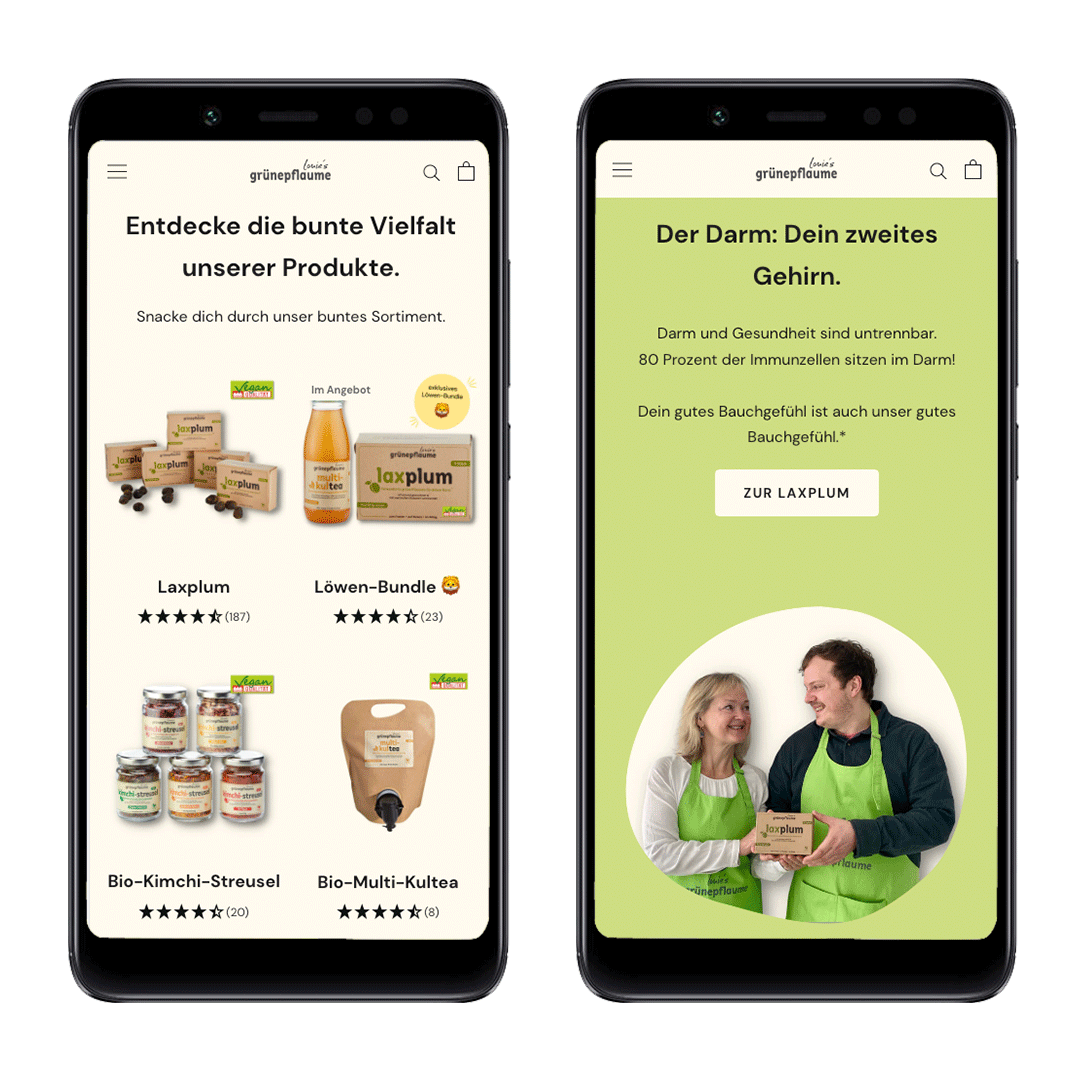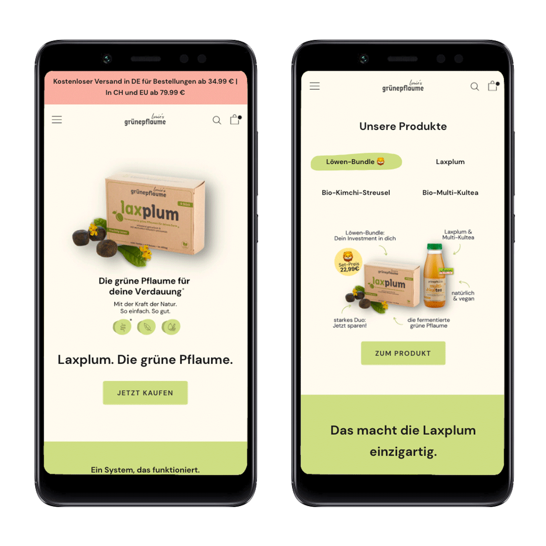 Der Shop besteht zu einem Großteil aus Sections, die individuell nach Screendesign für Grünepflaume entwickelt wurden. Die Hero Section setzt den Bestseller, die Laxplum, sehr gut in Szene.