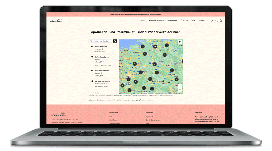 Mit Hilfe der App Stockist haben wir kurz vor der Ausstrahlung knapp 400 Apotheken und Reformhäuser auffindbar gemacht. Die App ermöglicht die Pflege der Filialen mit einer CSV-Datei.
