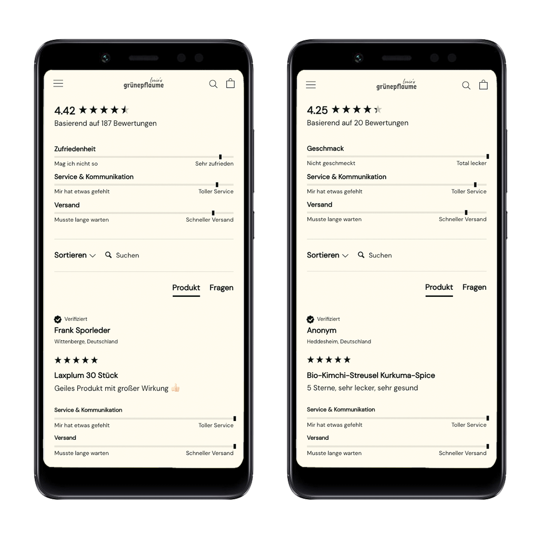 Wir haben das Tool Reviews.io für Produkt- und Shop-Bewertungen integriert. Dabei fragen wir gezielt produktspezifische Fragen zum Geschmack oder zur Zufriedenheit. So können USPs hervorgehoben und Ängste genommen werden.