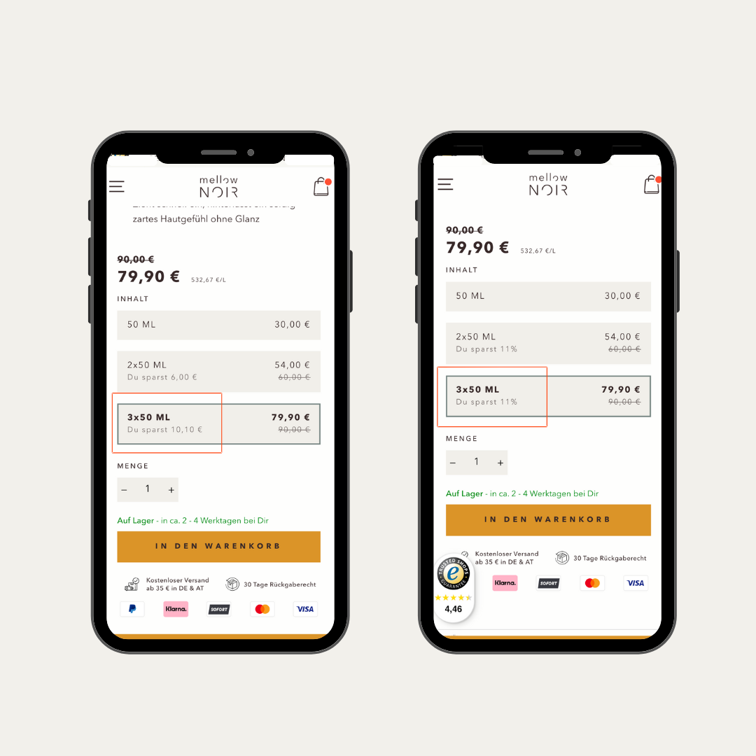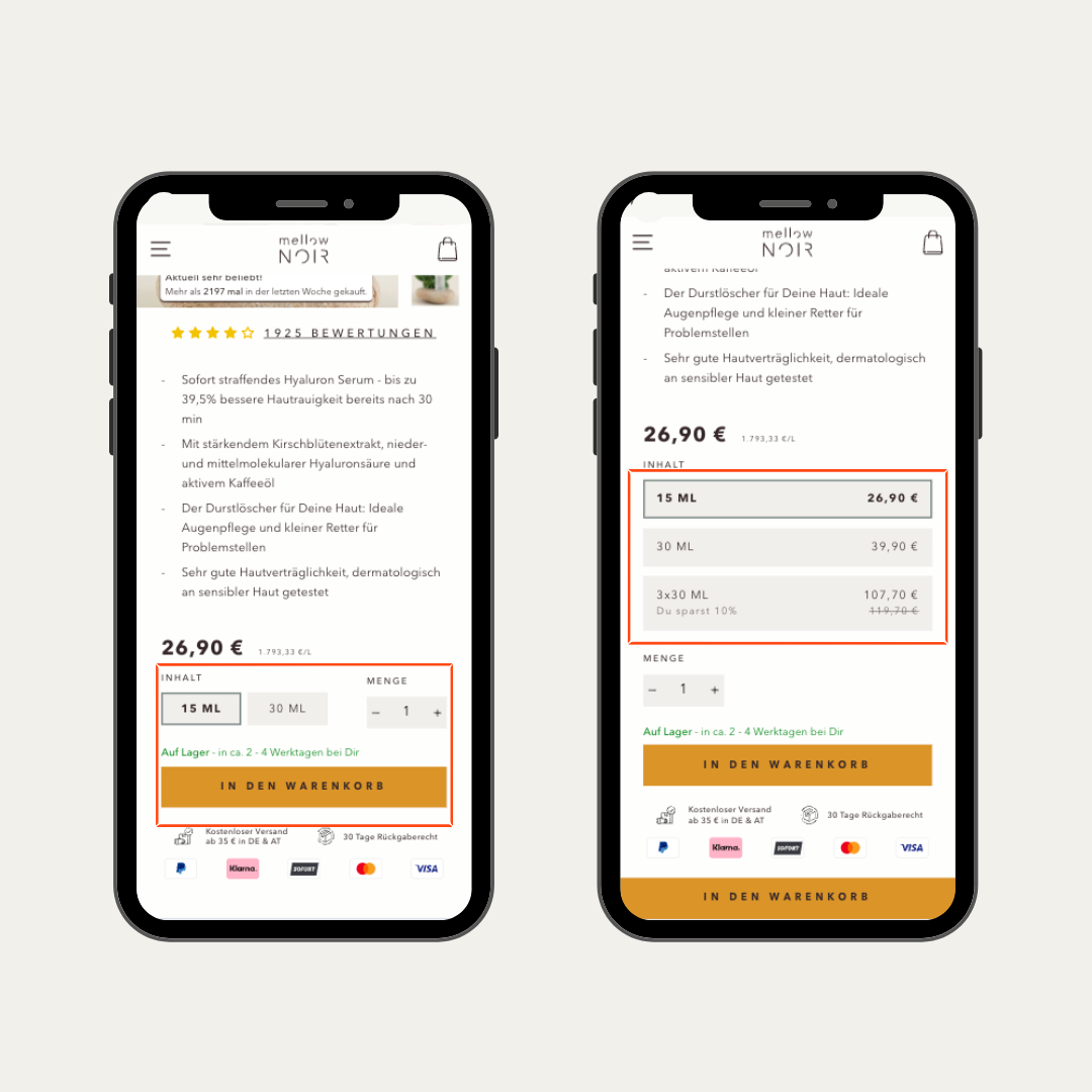 Für die Variantendarstellung wurden verschiedene Designoptionen des Variant Pickers getestet. Die ursprüngliche Variante stellte die Produktoptionen nebeneinander dar, während die alternative Darstellung diese untereinander, zusammen mit dem Preis, anzeigt.
