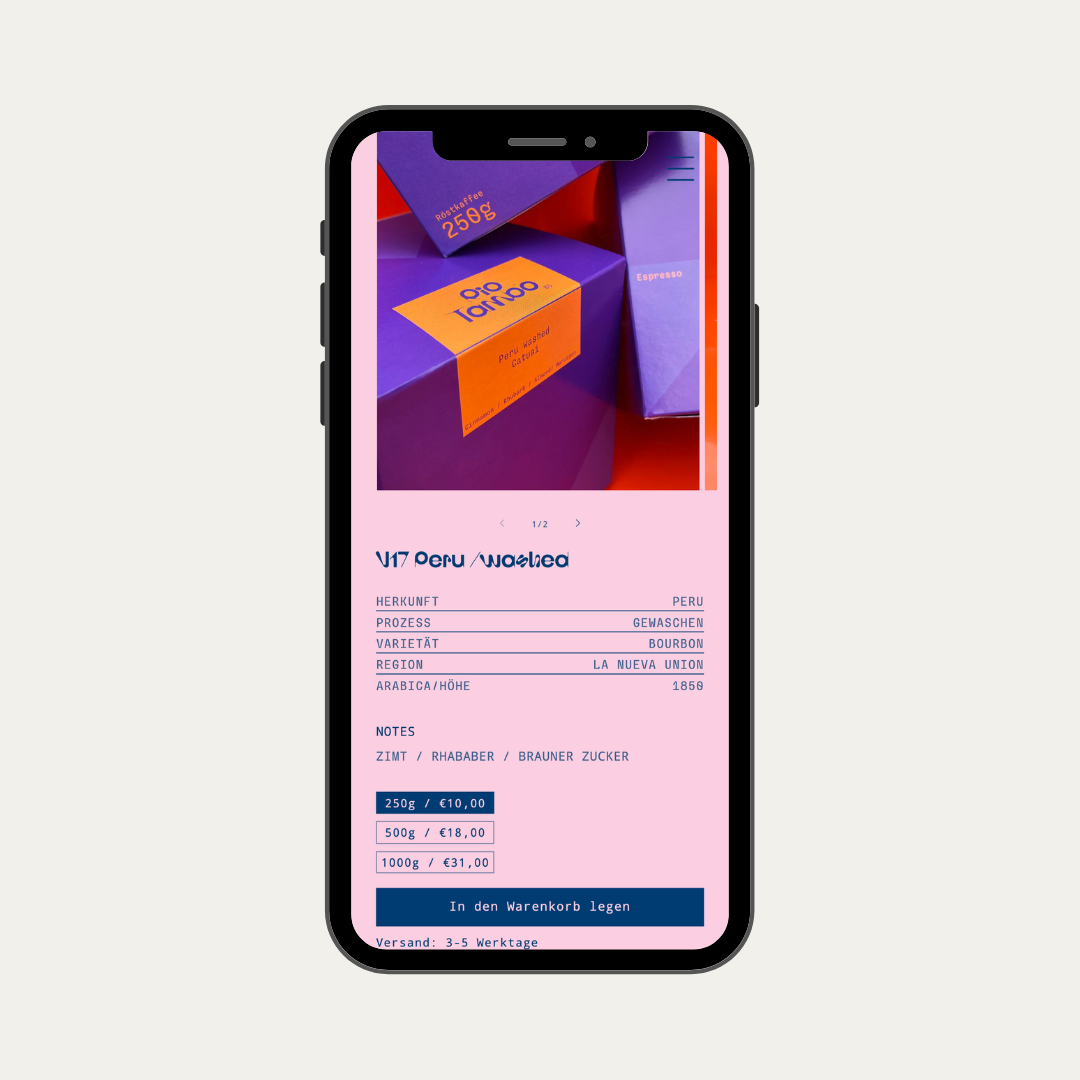 Jede Produktseite für Kaffee zeigt die wichtigsten Informationen zu Röstgrad, Herkunftsland & Anbauhöhe in einer Tabelle. Die Variant Picker zur Auswahl der Menge des Kaffees wurden vom Look an die Buttons angepasst.