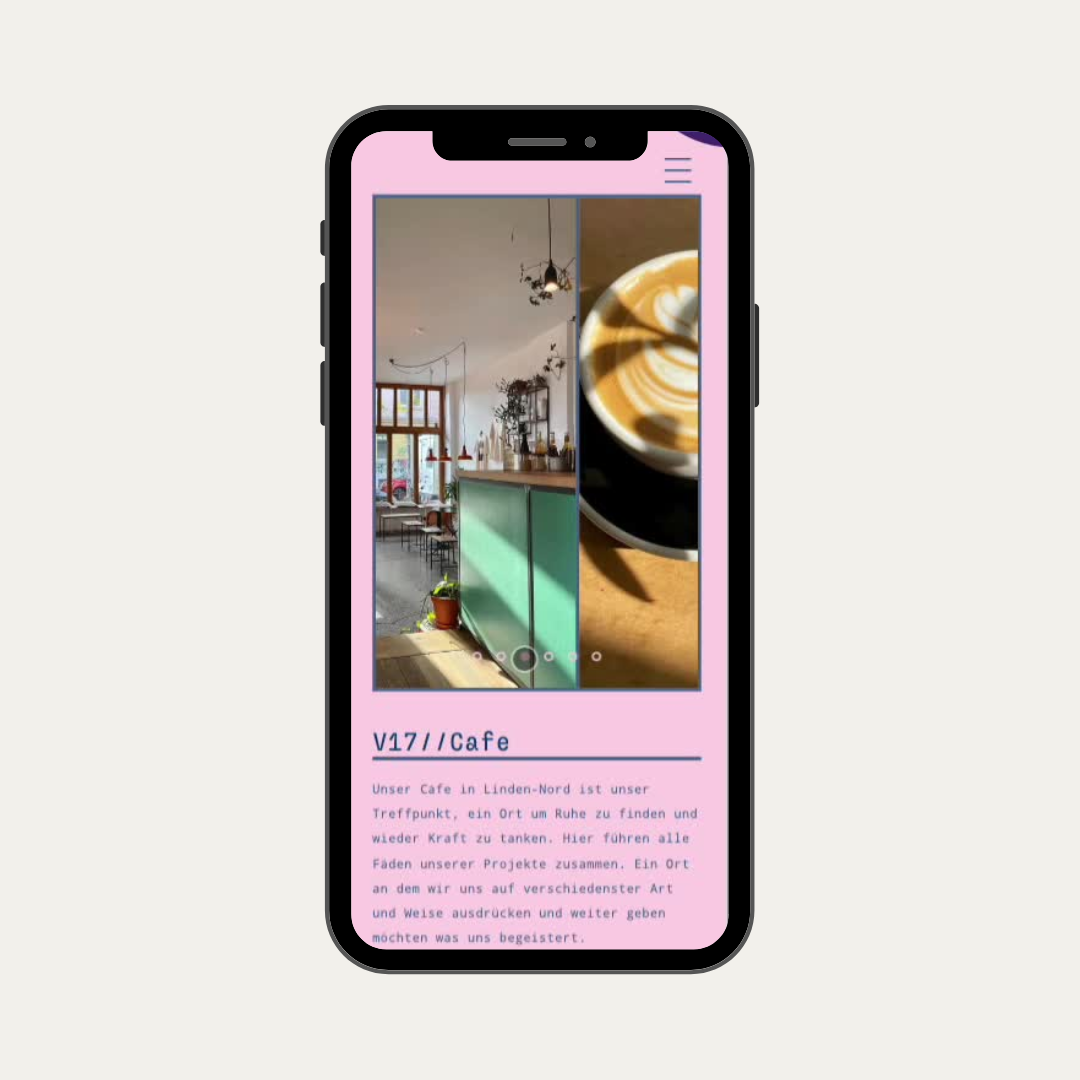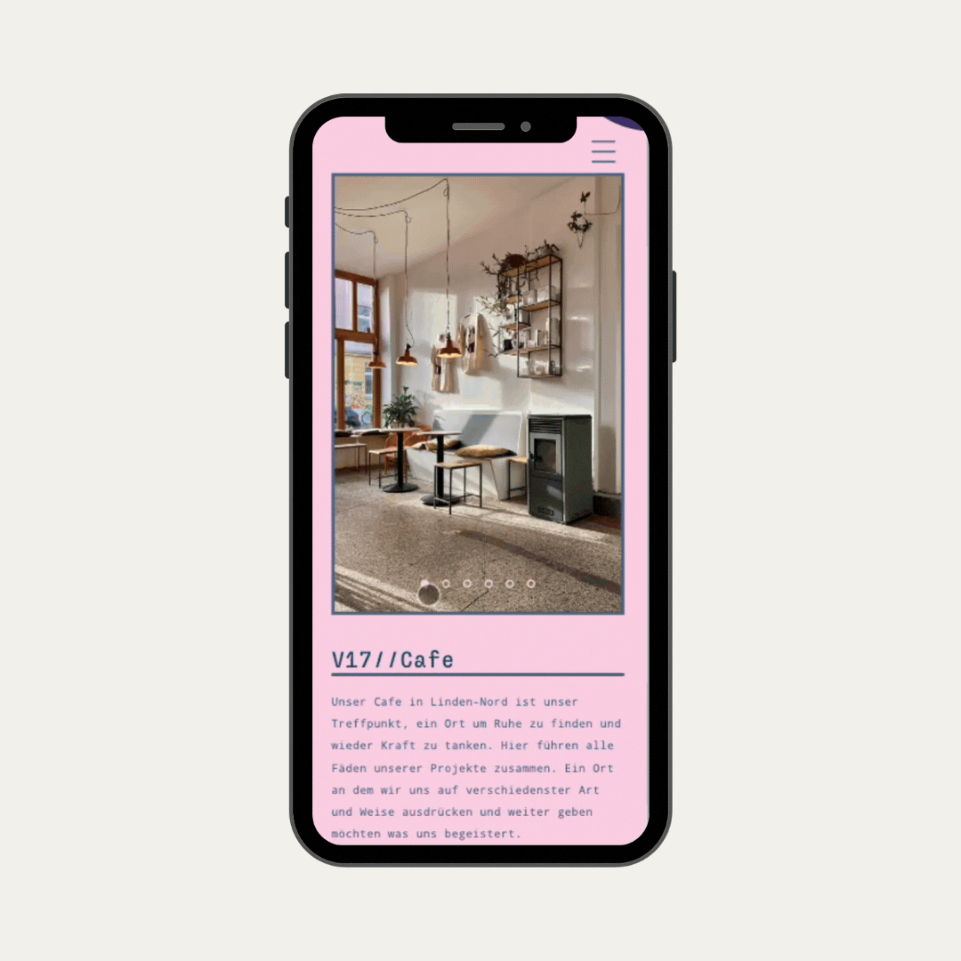 Individuelle Slideshows wurden integriert, um den Kund:innen einen visuell ansprechenden Einblick in die verschiedenen Standorte und das einzigartige Ambiente von V17 zu bieten.