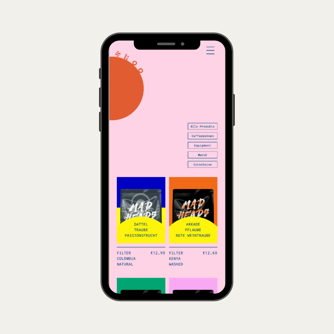 Die Hero Section nutzt ein kreisförmiges Designelement, das gezielt die verschiedenen Shop-Bereiche miteinander verbindet. Diese unkonventionelle Form fördert nicht nur eine einfache Navigation durch den Shop, sondern spiegelt auch die organischen Formen wider, die sich durch das gesamte Design ziehen.