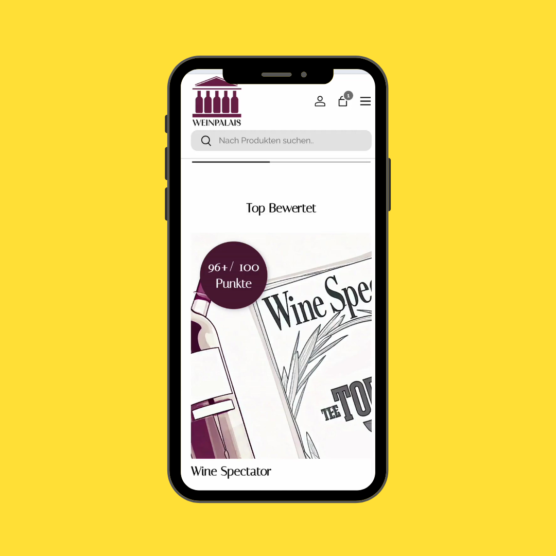 Kund:innen können direkt auf der Startseite die bestbewerteten Weine entdecken. Badges geben eine sofortige visuelle Rückmeldung zu den Bewertungen jedes Weins. Diese Funktion unterstreicht die Qualität und Expertise von Weinpalais in der Weinwelt.