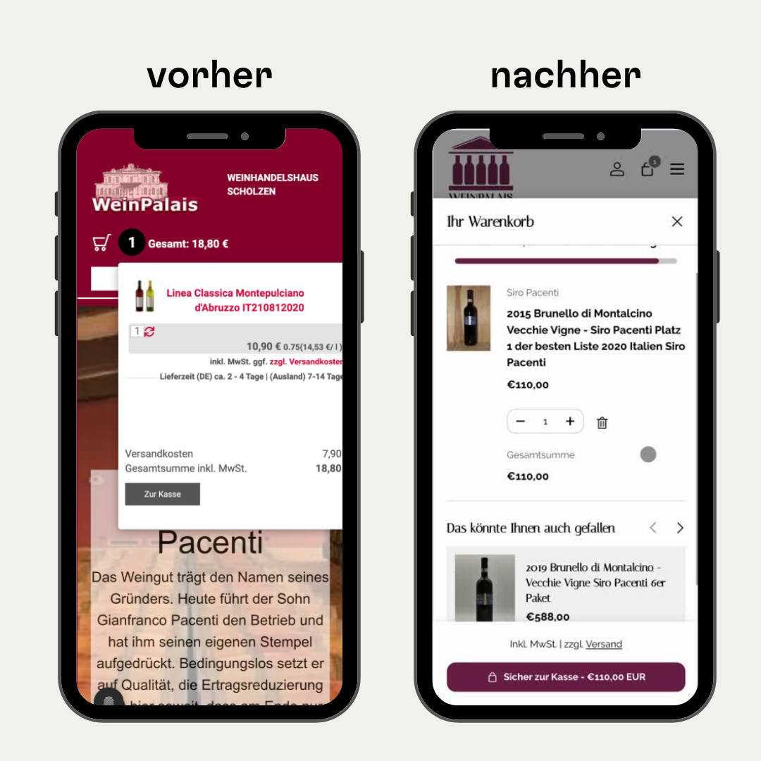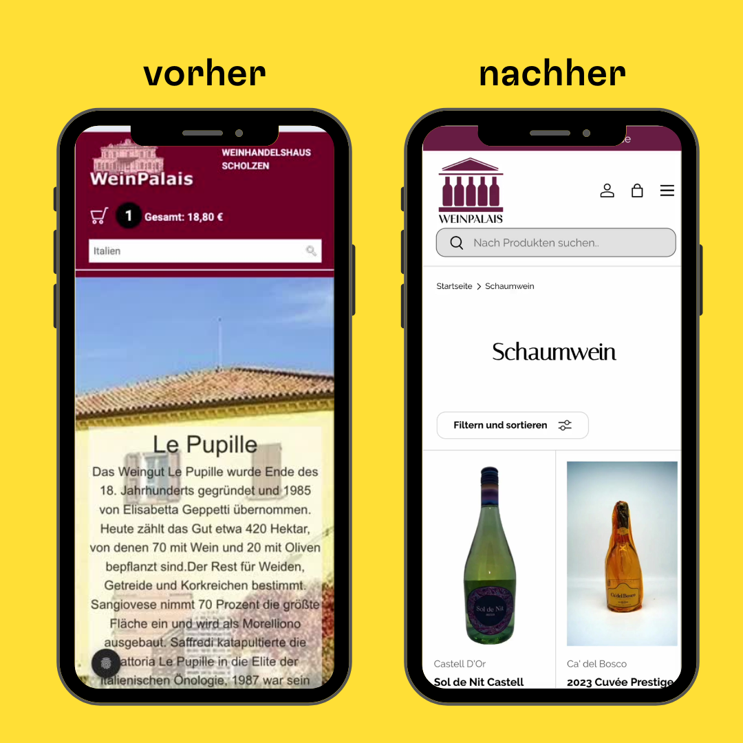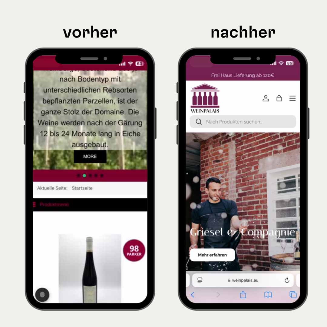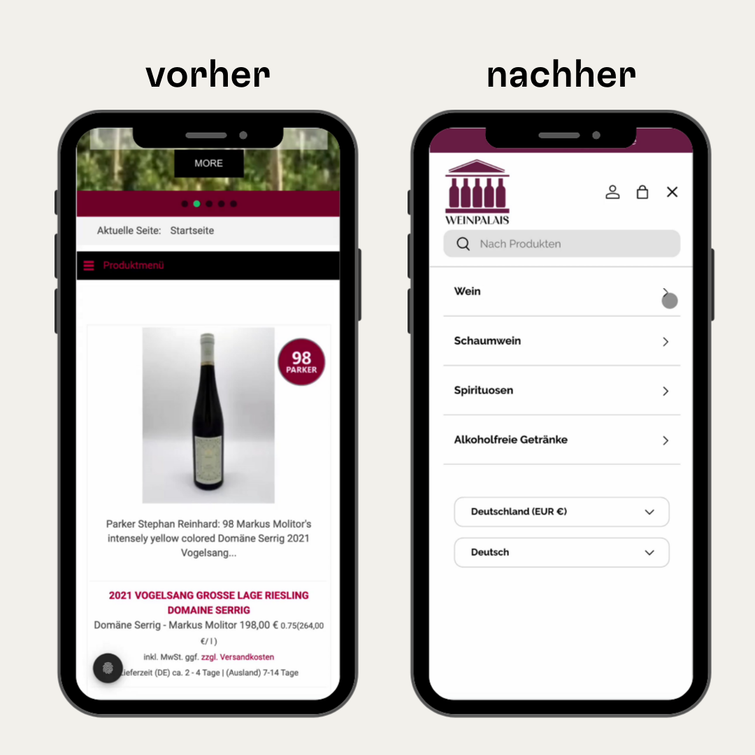 Der alte Joomla-Shop entsprach nicht mehr den heutigen Anforderungen. Langsame Ladezeiten, veraltetes Design, technische Ausfälle – ein Upgrade musste her. Gemeinsam mit Weinpalais haben wir den Umzug zu Shopify umgesetzt. Neben der vollständigen Datenmigration stand ein modernes Design im Fokus, das das besondere Sortiment optimal in Szene setzt.