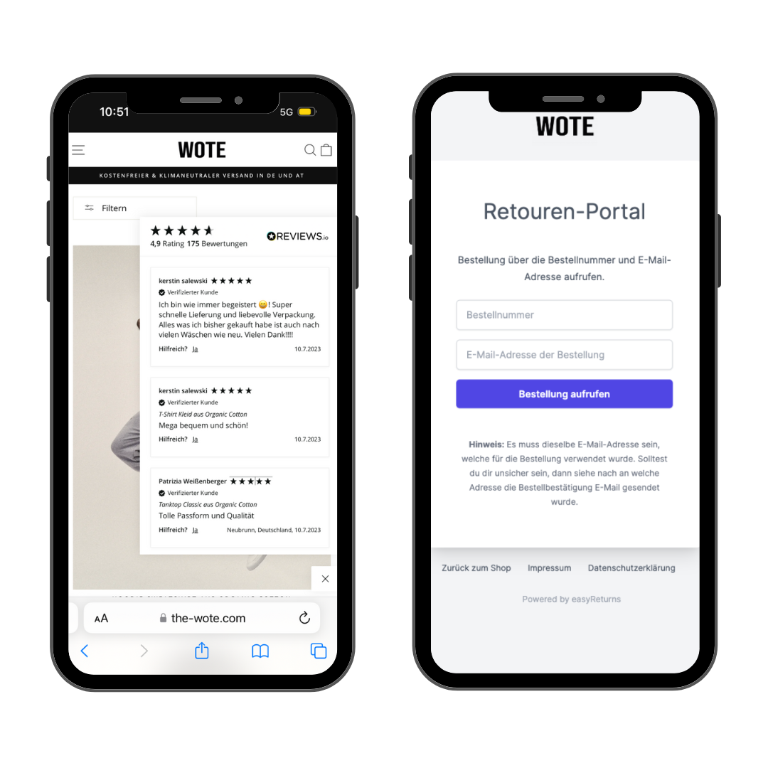 Für Bewertungen haben wir das Tool Reviews.io implementiert. Dabei fokussieren wir uns auf das Sammeln von Shop-Bewertungen, da die Kollektionen sich jedes Jahr ändern.